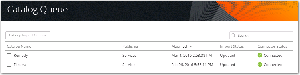 3. Select the name of your App Portal catalog (such as Flexera) and click the Catalog Import Options button. The Entire Catalog tab of the selected catalog page is displayed.