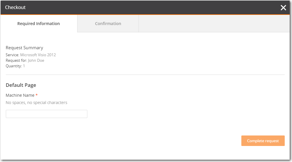 5. Enter the Machine Name and click on the Complete request button. The Confirmation tab of the Checkout process opens and the Request Submitted message is displayed.