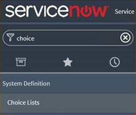 1. Login to ServiceNow and search for "choice" in the navigation panel, and then select System Definition > Choice Lists.