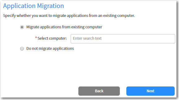 If you want to migrate applications from an existing computer to the target computer, select the Migrate applications from existing computer option. If you select this option, the Select computer field is displayed, where you are prompted to search for the existing computer.