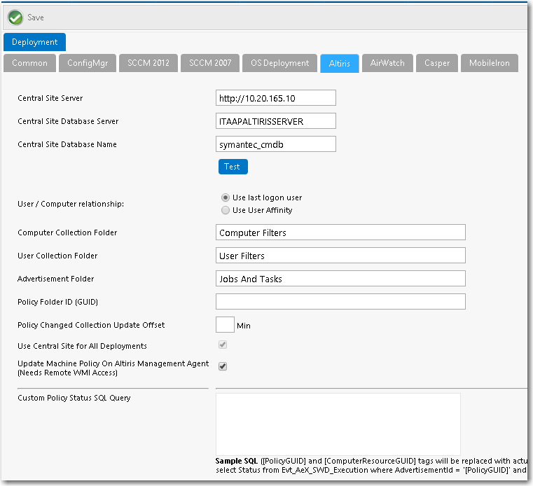 - In the Central Site Database Name, enter the database name of the Altiris Notification Server database.